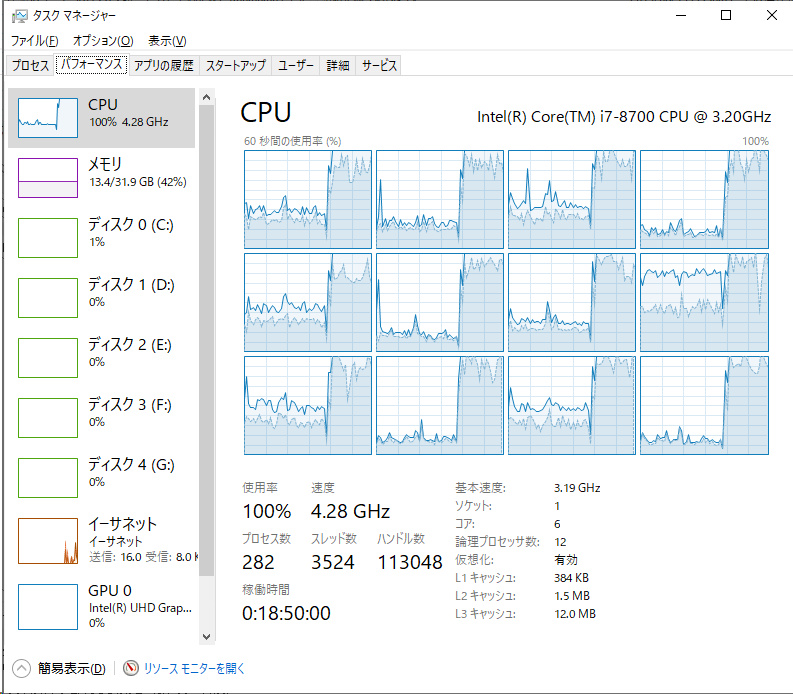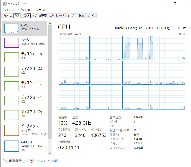 | 1スレッドのみ100%になったり収まったりを繰り返す様子 | <- を再現しようとしたら全スレッド食い潰した |